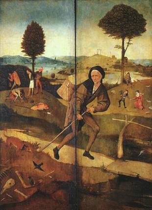 Quando as portas se fecham vemos a quintessência do que nos reserva no interior do retábulo. Bosch retraça o caminho no qual avança a humanidade, insistindo no percurso já cumprido. É o homem só e único, lançado a seus próprios recursos, que deve se esforçar por percorrer todo este caminho. Bosch vê o homem como um errante pobremente vestido que se curva sob o peso de sua mochila, uma mochila que contém todas as misérias do mundo . No plano de fundo, acima da cabeça do viajante, se eleva o Calvário e suas forcas, evocando claramente o mistério do Golgotha que todo homem deve guardar sempre em vista se não quer perder o bom caminho. A sua esquerda, reinam a matança e a violência enquanto à sua direita, esqueletos nos anunciam de maneira condensada o conteúdo das imagens pintadas no interior do retábulo. Que o homem representando a humanidade em marcha esteja bem plantado no centro do exterior das portinholas do retábulo não é um acidente. O Mal materializado por este cão raivoso tenta atrair a atenção sobre ele e distrair assim o viajante do caminho que deve seguir. Ele pode disto se defender batendo sua vara. A passarela conduzindo ao caminho do futuro é certamente balançante mas certamente atravessável. Incumbe a cada homem conduzir ele mesmo o combate da vida , tal como este caminhante lançado a sua sorte e que resume para nós a meditação à qual este altar quer nos conduzir.