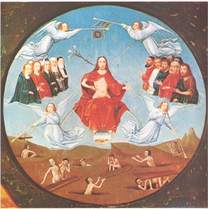 O medalhão do Juízo Final, acima à direita, fecha este círculo. Os mortos são chamados à vida e levam seu olhar para o medalhão da esquerda representando o homem na hora de sua agonia. As trompetas dos anjos carregam flâmulas sobre as quais estão pintados os instrumentos que serviram ao suplício do Cristo durante seu Calvário. Este pensamento de redenção domina o conjunto da obra. Se o Cristo entrona o reino celeste em quadro ainda limitado, supervisionando por assim dizer o estado de purificação das almas que apresentam diante dele, o Juízo Final o mostra planando nos céus sobre um Cores Arco-Iris com, aos seus pés, o globo terrestre.