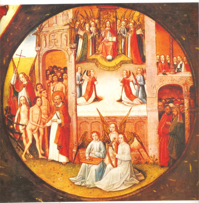 Denominado “Reino Celeste”, este medalhão inferior direito insiste na influência tumultuosa que reina na entrada do céu onde muitos desejariam penetrar. Mas as portas são estreitas e guardiões encarregados da manutenção da ordem velam pela paciência e o acesso àqueles que têm direito. Jesus está sentado em um trono, cercado de toda a hierarquia celeste. Decide o grau de purificação atingido por cada alma e lhe atribui em consequência o lugar que merece. O diabo não hesita em tentar ainda desviar as almas na entrada mesmo do paraíso . Mas como estas foram retiradas de seu envelope terrestre e aí estão desprovidas de sua casca carnal , o arcanjo Miguel intervem e rechaça Satã.